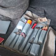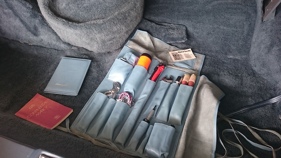 Handbuch des Besitzers in Leder eingehüllt mit Werkzeugtasche, ebenso in Leder eingefasst