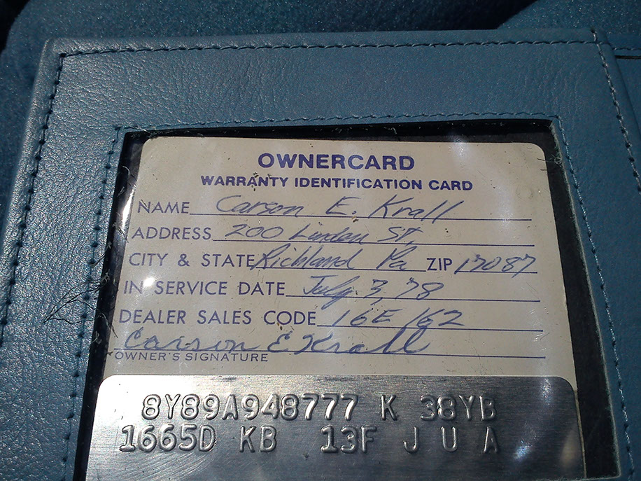 Am 18. Juli 1978 wurde er an Carson E. Krall aus Richland, Pennsylvania ausgeliefert. Seine Initialen zieren auch die Türen. 1995 ging er an Nick Gale, Duryea, Pennsylvania mit 4732 Meilen. Am 1. Oktober 2007 erwarb ihn dann Ulrich H. Steinberg aus Cedar Grove, New Jersey mit 9494 Meilen.